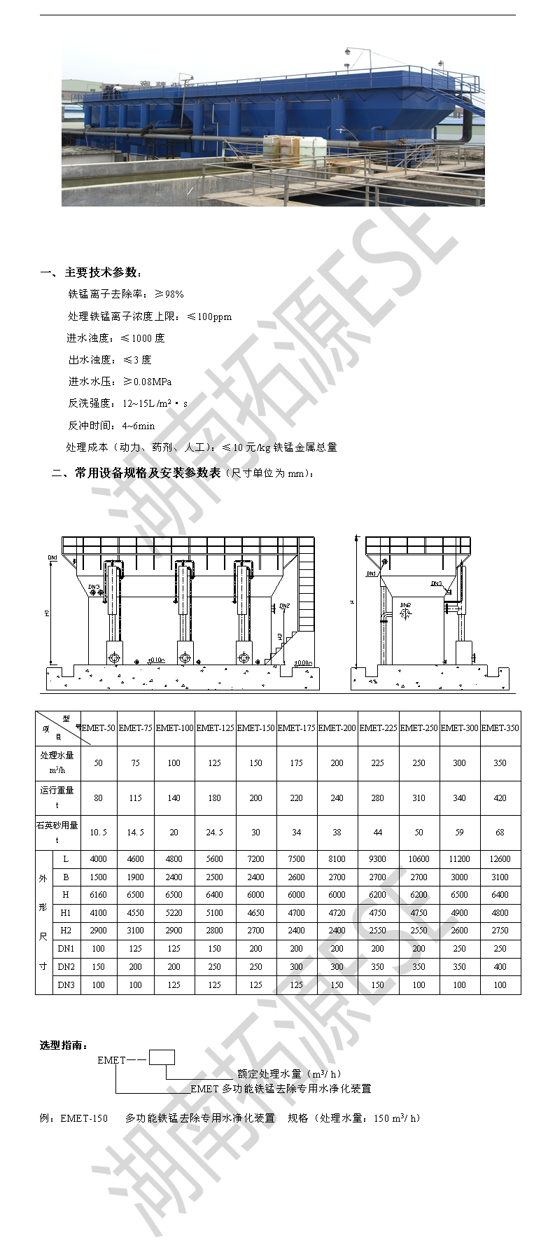 EMET多功能鐵錳去除專用水凈化裝置是我公司針對金屬礦山和冶煉企業(yè)中含鐵錳廢水開發(fā)的專用水處理裝置,可有效去除廢水中的鐵錳離子,高效過濾水中懸浮物和膠體,降低濁度,同時還實(shí)現(xiàn)金屬資源回收,廣泛應(yīng)用于錳礦山礦井涌水、冶煉企業(yè)含鐵錳工業(yè)廢水處理。該設(shè)備將重力自動加藥、氧化混凝反應(yīng)、高效斜管沉淀、多層濾料過濾和重力式無閥自動反沖洗、金屬污泥收集等工藝有機(jī)組合在一起,具有運(yùn)行成本低、耐沖擊負(fù)荷能力強(qiáng)、全自動反沖洗、故障率低、運(yùn)行穩(wěn)定和操作管理簡便等特點(diǎn)。設(shè)備采用立式組合結(jié)構(gòu),大大節(jié)省了占地面積。設(shè)備主體材質(zhì)采用碳鋼或鋼防腐,核心部件采用不銹鋼,選用PP蜂窩斜管和精制石英砂濾料。